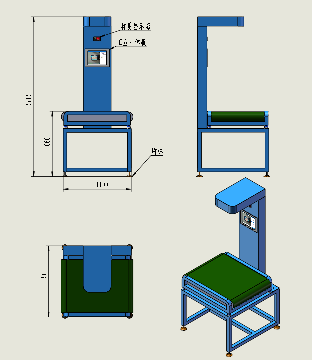 整機機架,烤漆或噴塑;測量模塊(測量鏡頭、數據線、軟件狗);稱重模塊(顯示儀表、稱重傳感器、數據線、電源適配器);掃碼槍