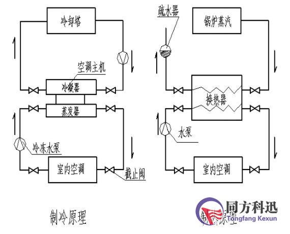 蒸汽經換熱后溫度降低,變成冷凝水,由疏水器排出。從而形成制冷循環。