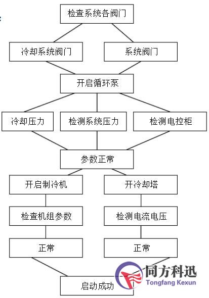 在開啟系統之前首先要檢查系統和冷卻水系統閥門是否處于正常開關狀態,無誤后開啟循環泵,檢測電流、電壓及冷卻水統水壓是否正常。各項參數正常后,開啟制冷機,檢測機組參數,參數正常后,啟動成功。