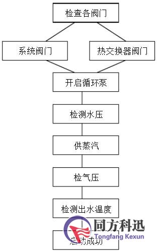 閥門,正常后開啟循環泵,檢測壓力,供蒸氣檢氣壓,出水溫度,啟動成功。