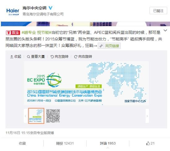 海爾中央空調向社會“眾籌節博藍”
