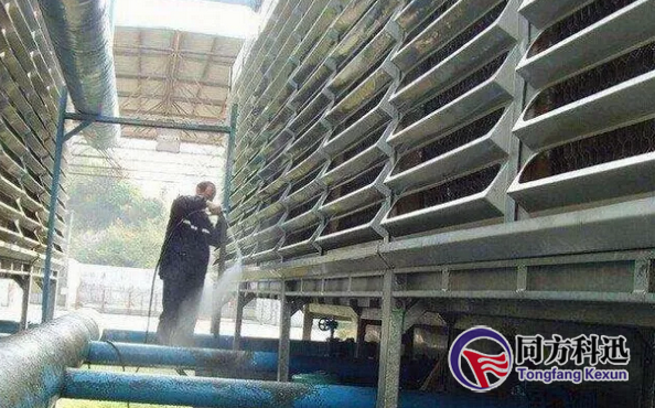 因為大部分冷卻水系統是開式循環系統,冷卻水與空氣長期接觸,空氣中CO2、SO2、NO2、O2等氣體便會溶解于冷卻水中并呈現酸性及強氧化性(如冷卻水泵的葉輪出現氣蝕現象),久而久之,冷卻水管、填料表面、集水盤形成一種含有嗜肺軍團菌、b-溶血性鏈球菌、藻類、O2+的等致病微生物附著物,嚴重的腐蝕水管、污染環境(冷卻塔附近下酸雨)。因此清洗時采用若酸性清洗劑,采用5‰的弱酸性除垢劑、緩蝕劑、鍍膜水溶液清洗三遍,清洗程序同上。