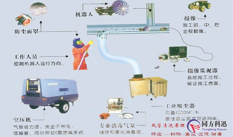 通風管道系統的清洗是清洗工作中的關鍵難點,因為通風管道一般在吊頂內,即使不在吊頂內因為風管都是密封連接的,也很難清洗,常采用機械清洗方法?,F在常見的清洗方式是從機組的帆布軟連接處將檢測機器人或氣動機器人放置在通風管道內,通過管道外的機器人操控箱控制通風管道內的清洗機器人,對于含塵量較多的管道系統還得用風管集塵器徹底收集管道中的垃圾,以防止造成二次污染。